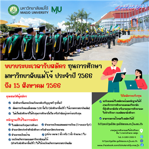 ขยายระยะเวลารับสมัคทุนการศึกษามหาวิทยาลัยแม่โจ้ ประจำปีการศึกษา 2566 ถึง 15 สิงหาคม 2566 วิธีการสมัคร: ---> ขอรับใบสมัครและส่งใบสมัครพร้อมหลักฐานจำนวน 1 ชุดได้ที่งานบริการการศึกษาของคณะ/วิทยาลัยที่นักศึกษาสังกัด หรืองานทุนการศึกษาและให้คำปรึกษา กองพัฒนานักศึกษา ชั้น 2 อาคารอำนวย ยศสุข ---> ดาวน์โหลดใบสมัครได้ที่ https://guide-guidance.mju.ac.th/goverment/20111119104834_guide.guidance/Doc_25660710132436_507158.pdf ---> อ่านรายละเอียดเพิ่มเติมที่ https://guide-guidance.mju.ac.th/goverment/20111119104834_guide.guidance/Doc_25641117150351_589480.pdf