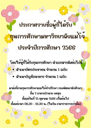 ประกาศรายชื่อผู้ที่ได้รับทุนการศึกษามหาวิทยาลัยแม่โจ้ ประจำปีการศึกษา 2566