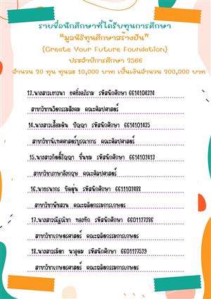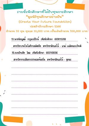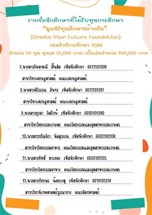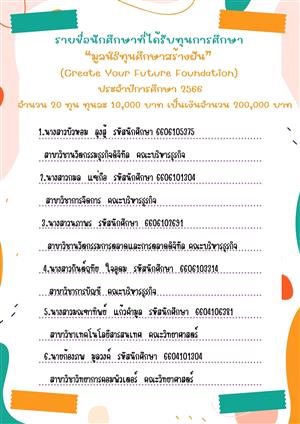 ??ประกาศรายชื่อนักศึกษาที่ได้รับทุนการศึกษา "มูลนิธิทุนศึกษาสร้างฝัน" ประจำปีการศึกษา 2566